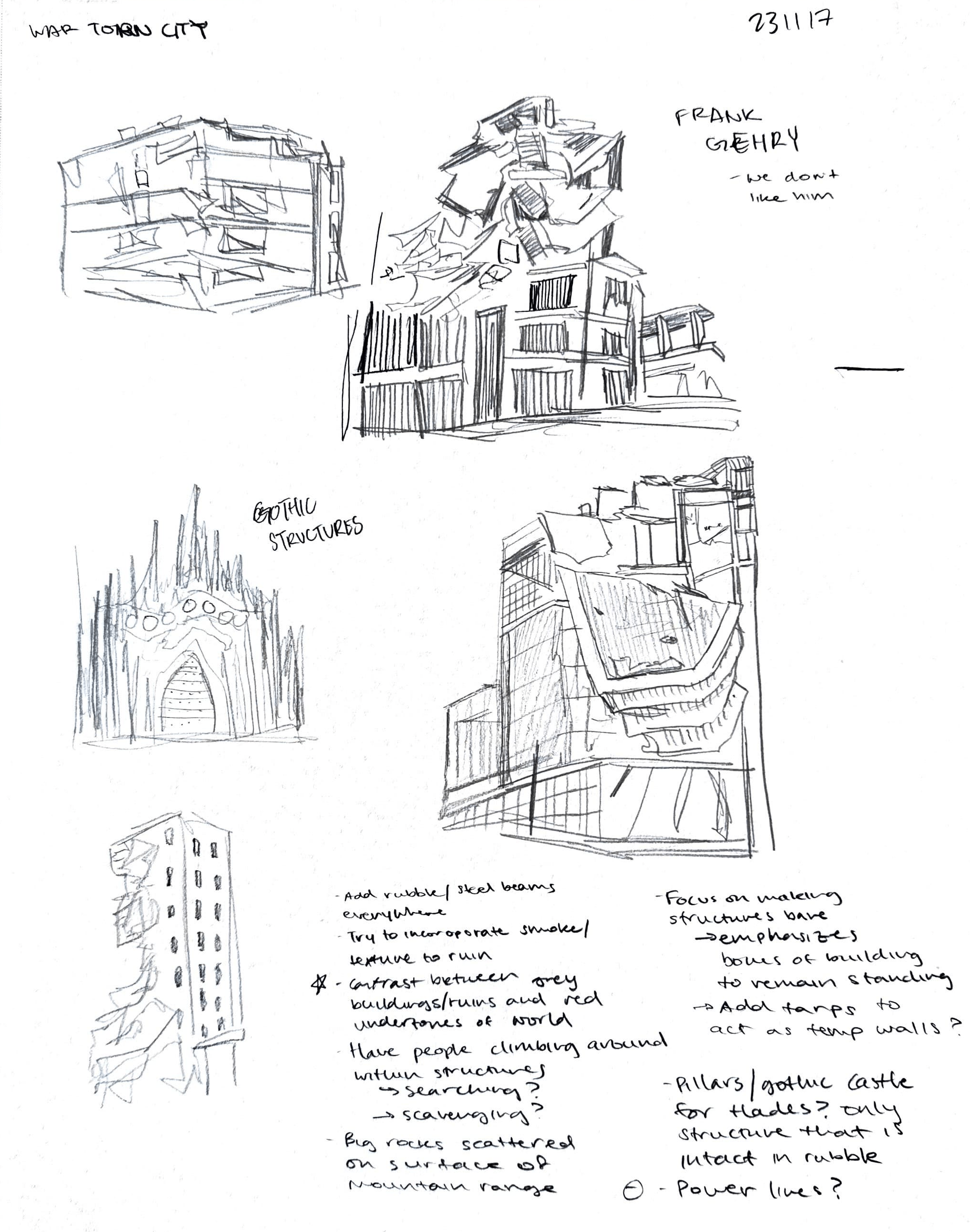 A brainstorm of buildings to add to the triptych. The underworld is one of dire thoughts and emotions, a dark color palette emphasizing how uncomfortable the place would be. Rather than creating structures that were livable, it only seemed natural to include ruins.